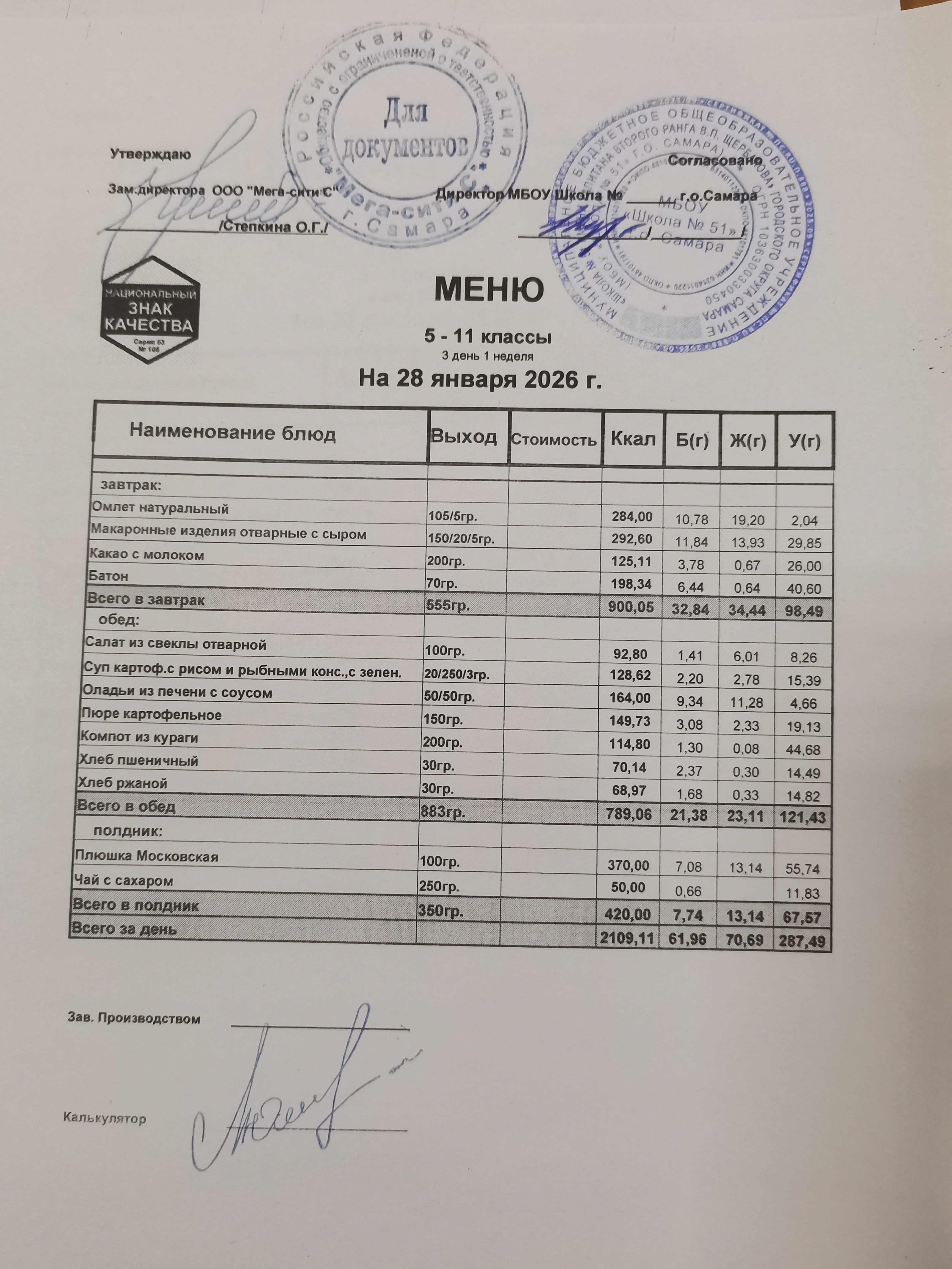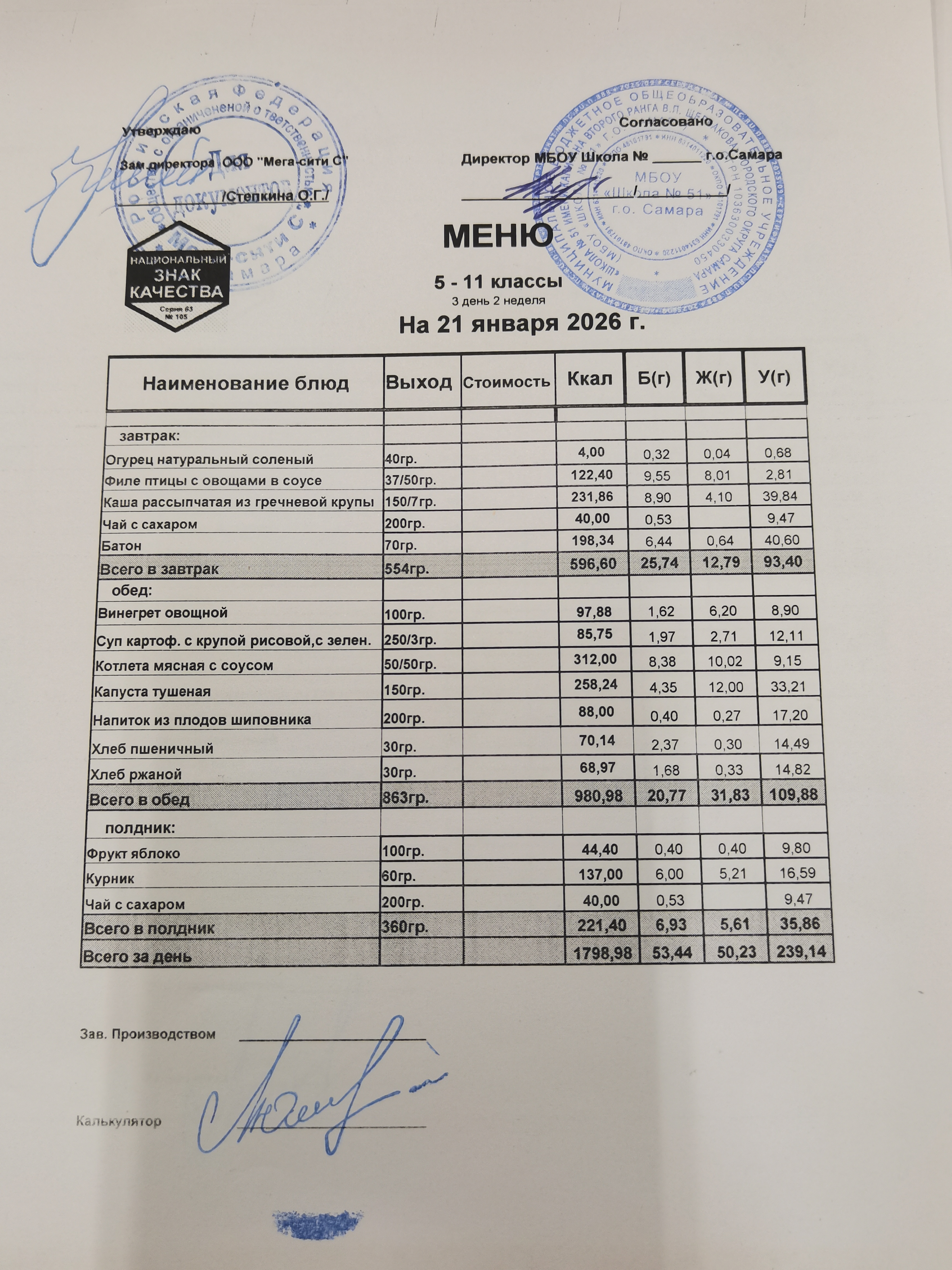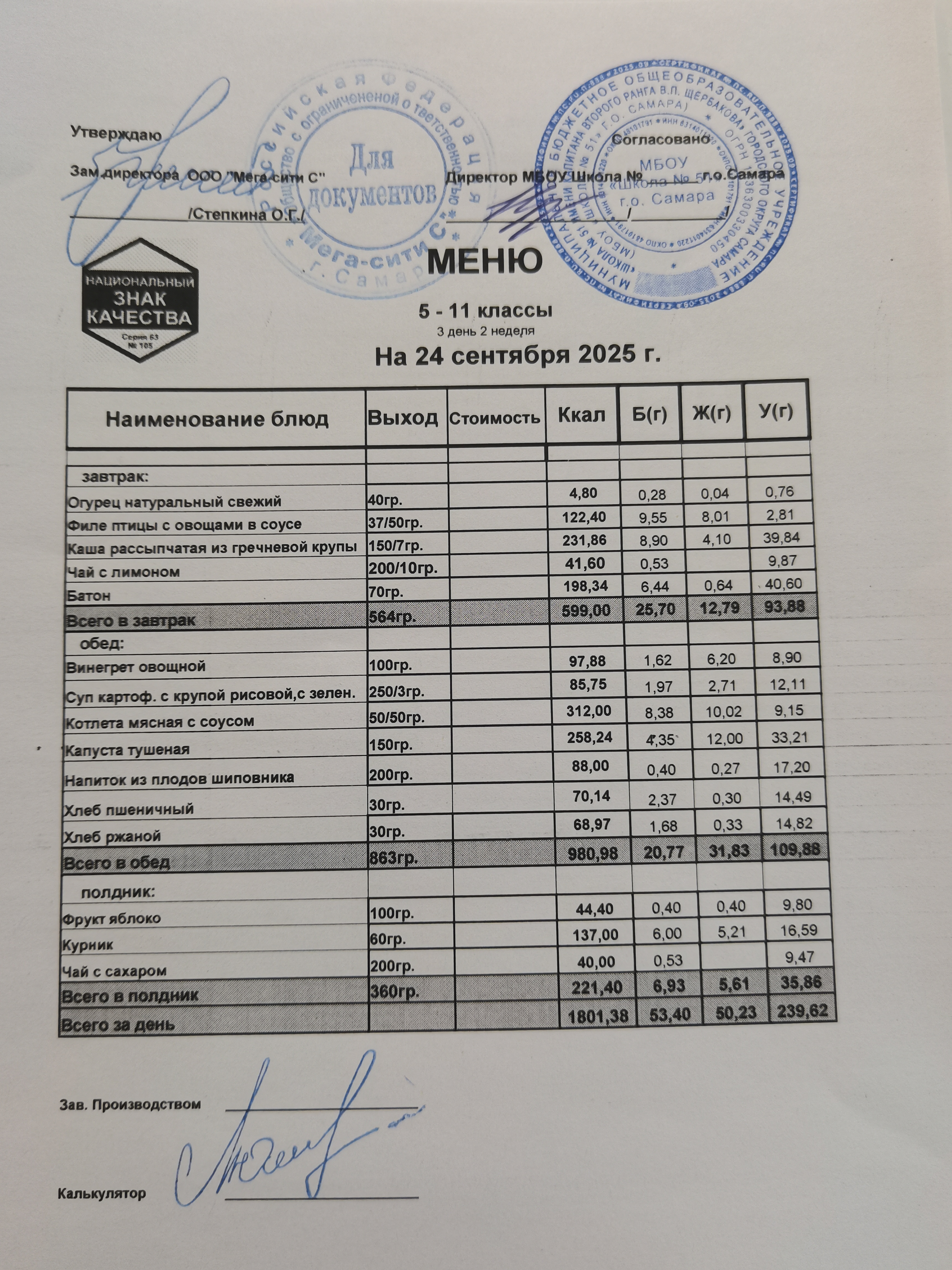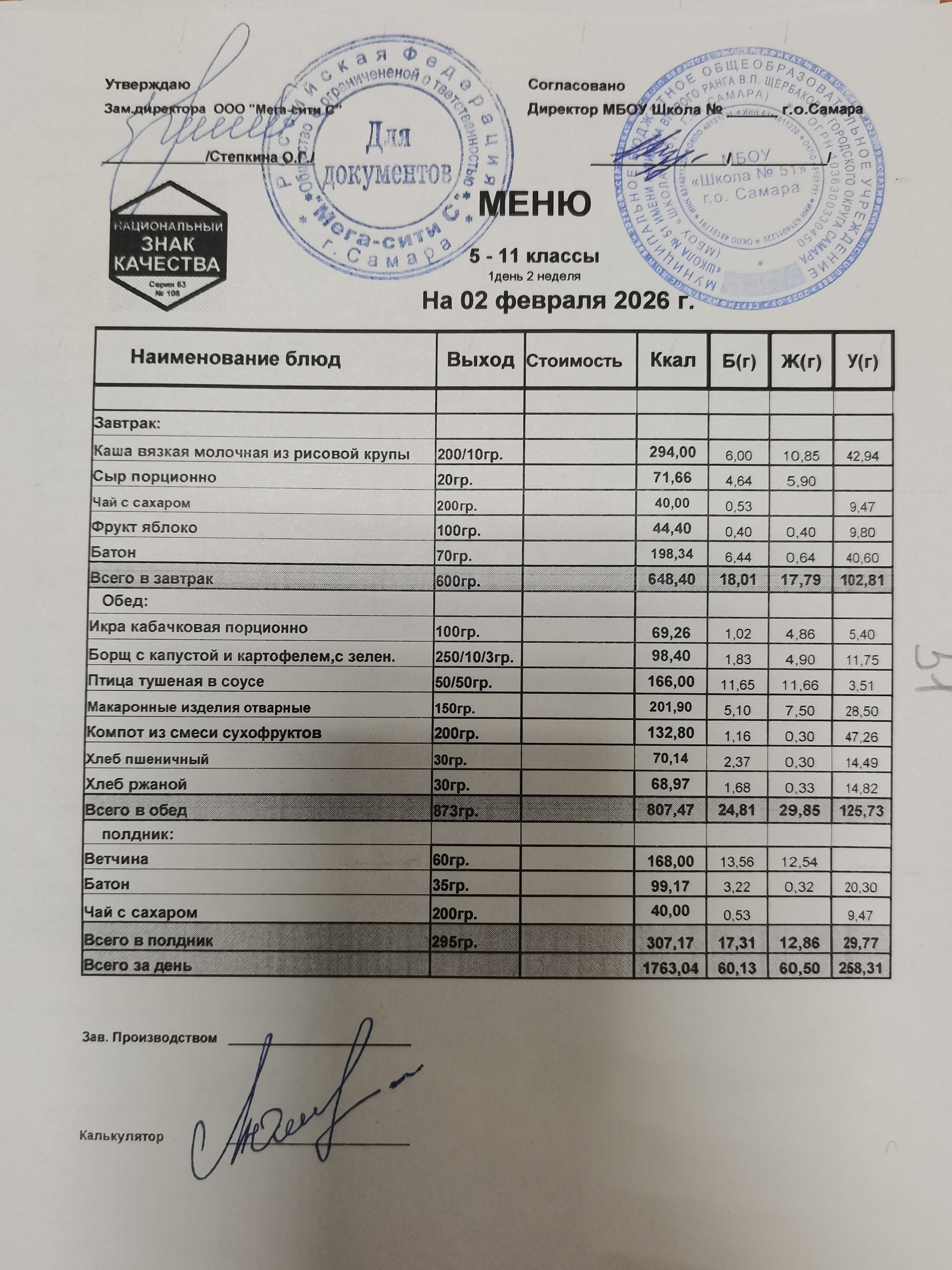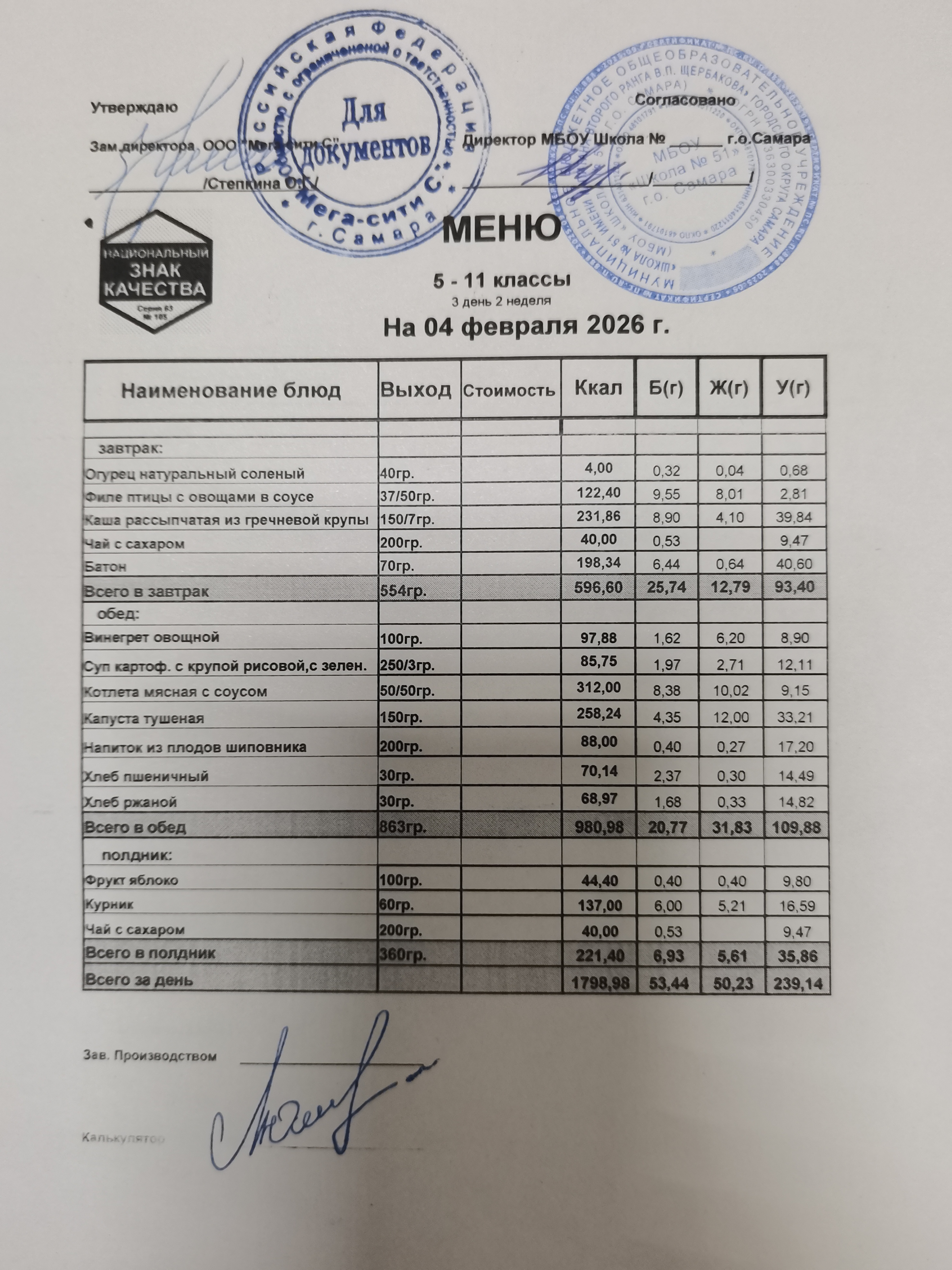Актуальное ежедневное меню по школе