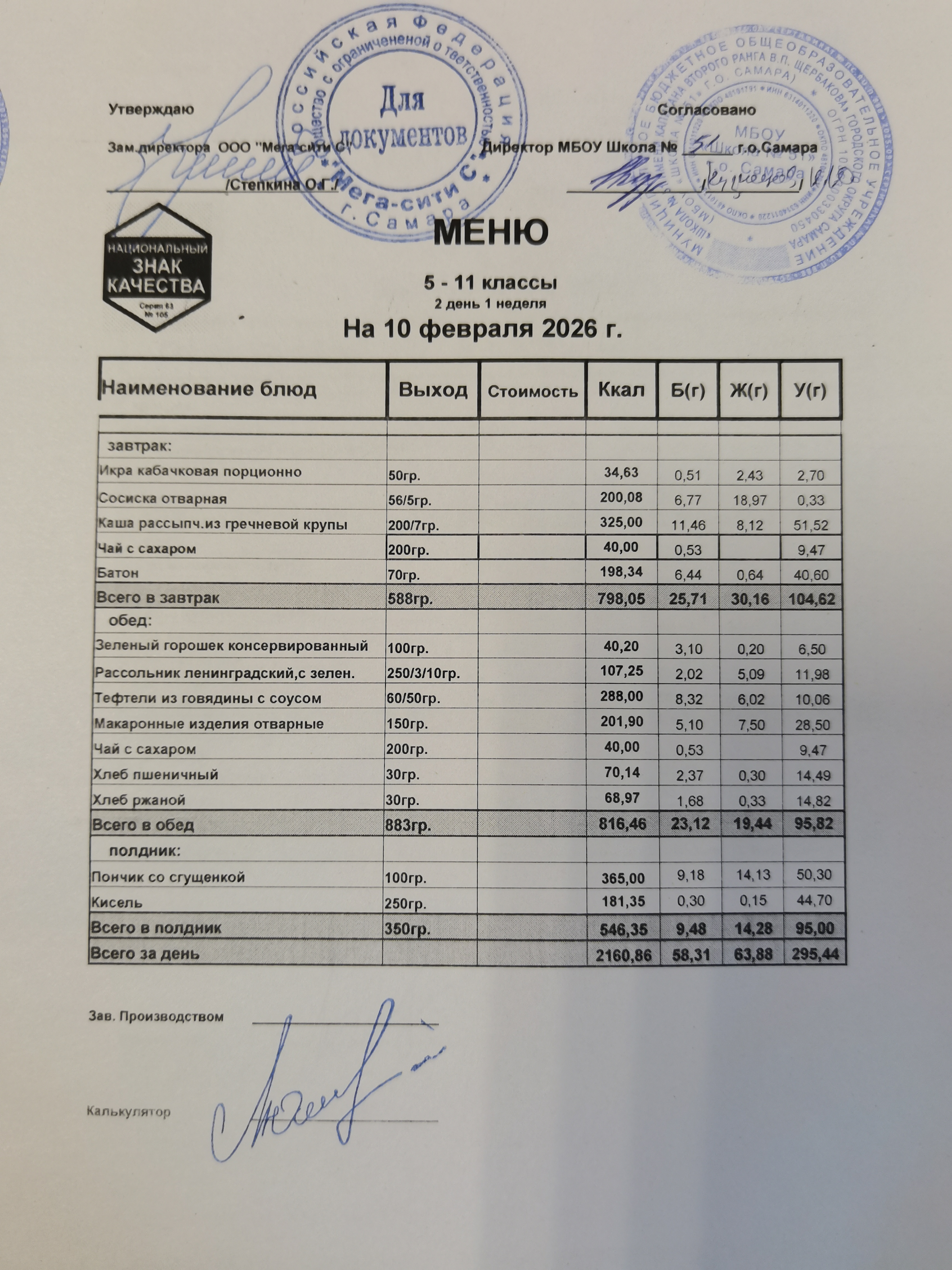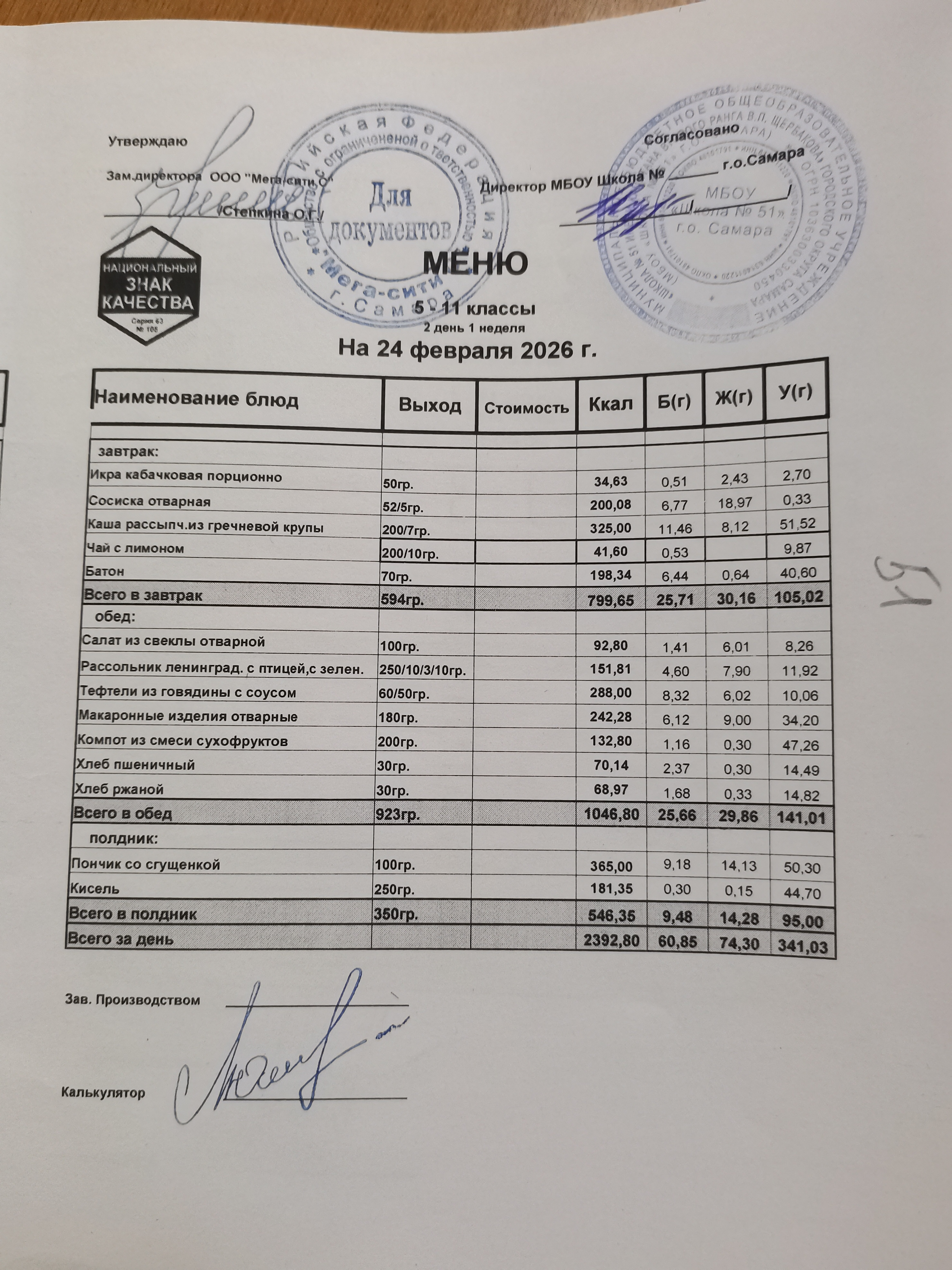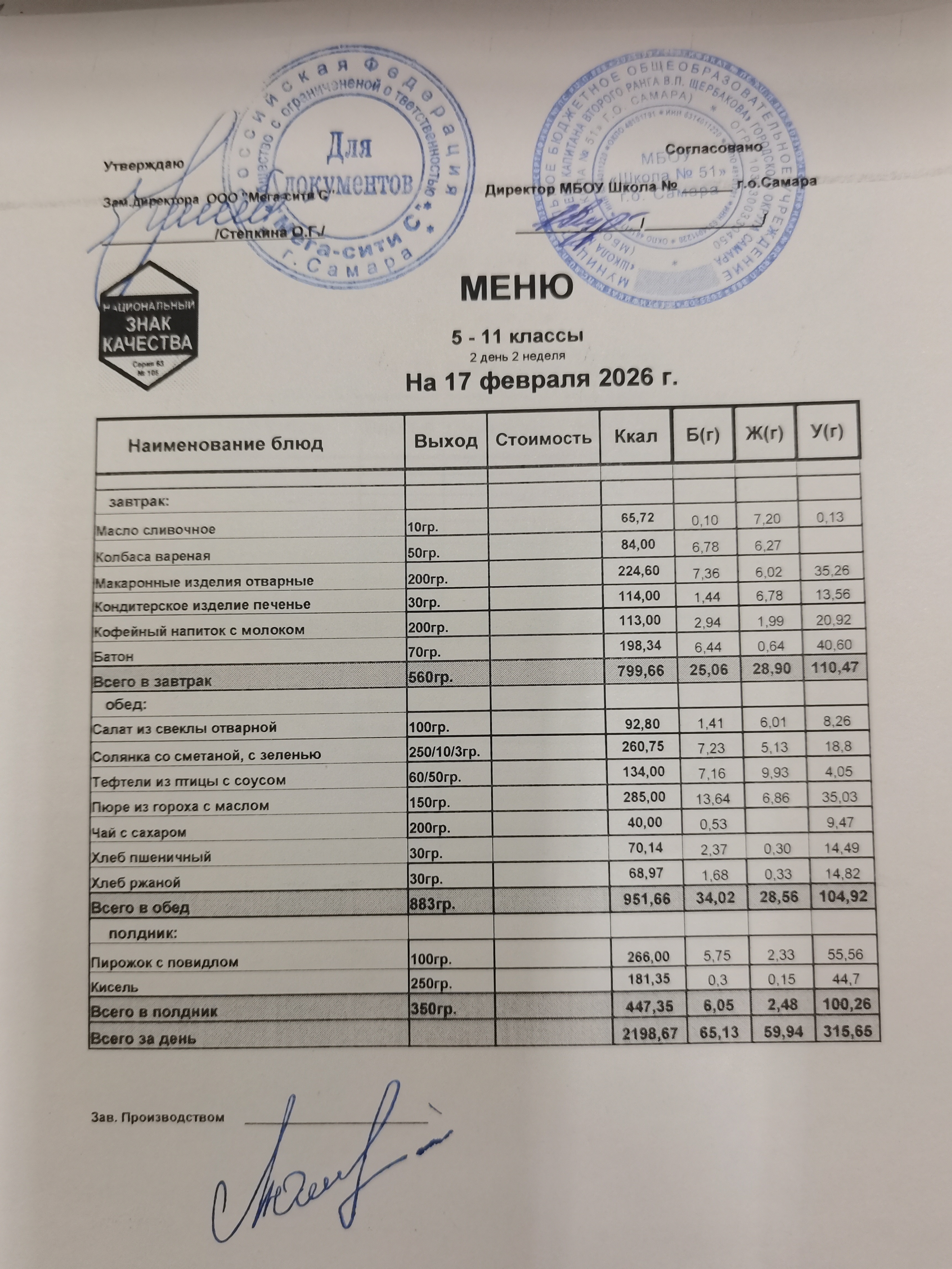 ответственном в МБОУ Школе № 51 г.о. Самара за организацию питания